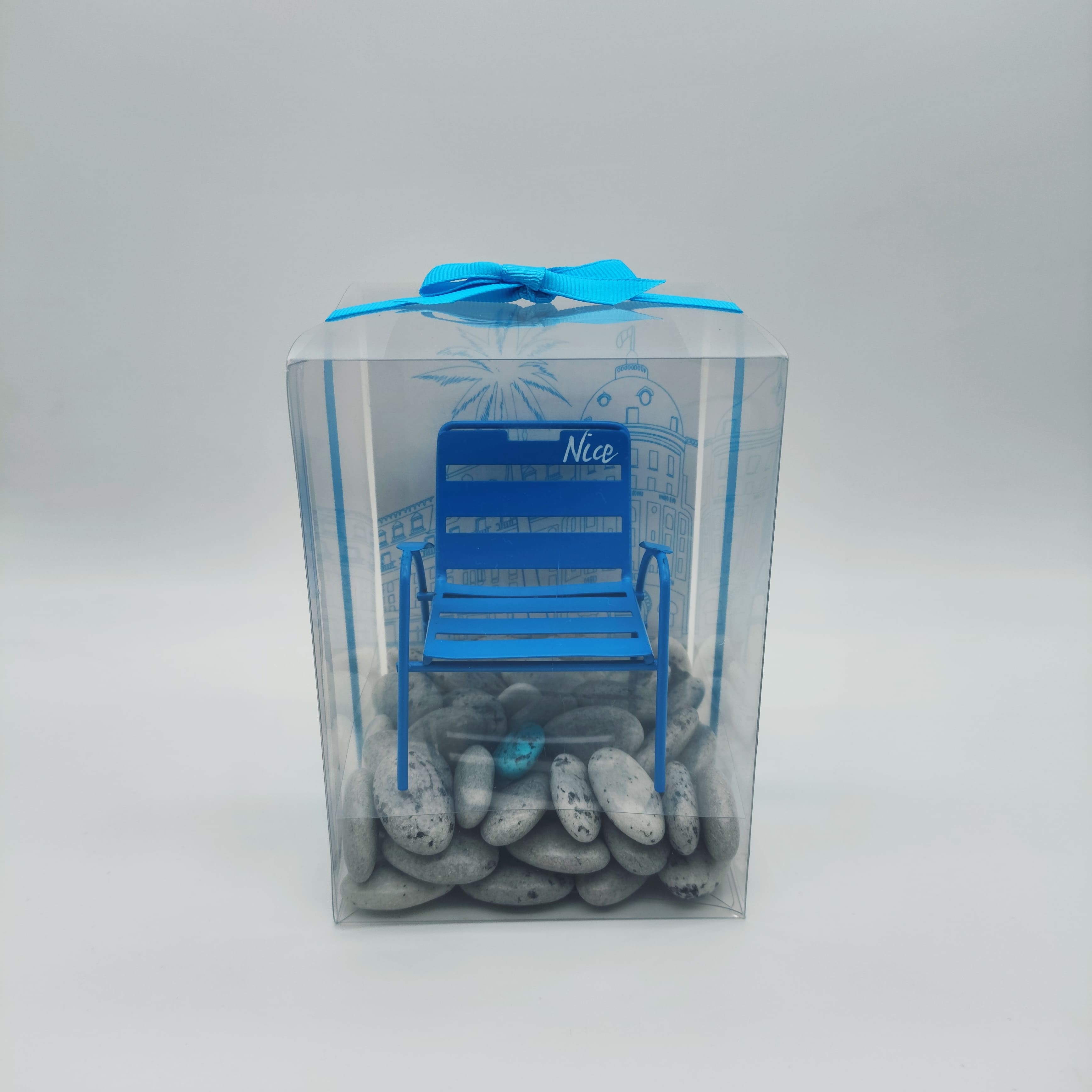 Coffret transparent de 250g de Galets en Chocolat et chaise bleue métal grand modèle.