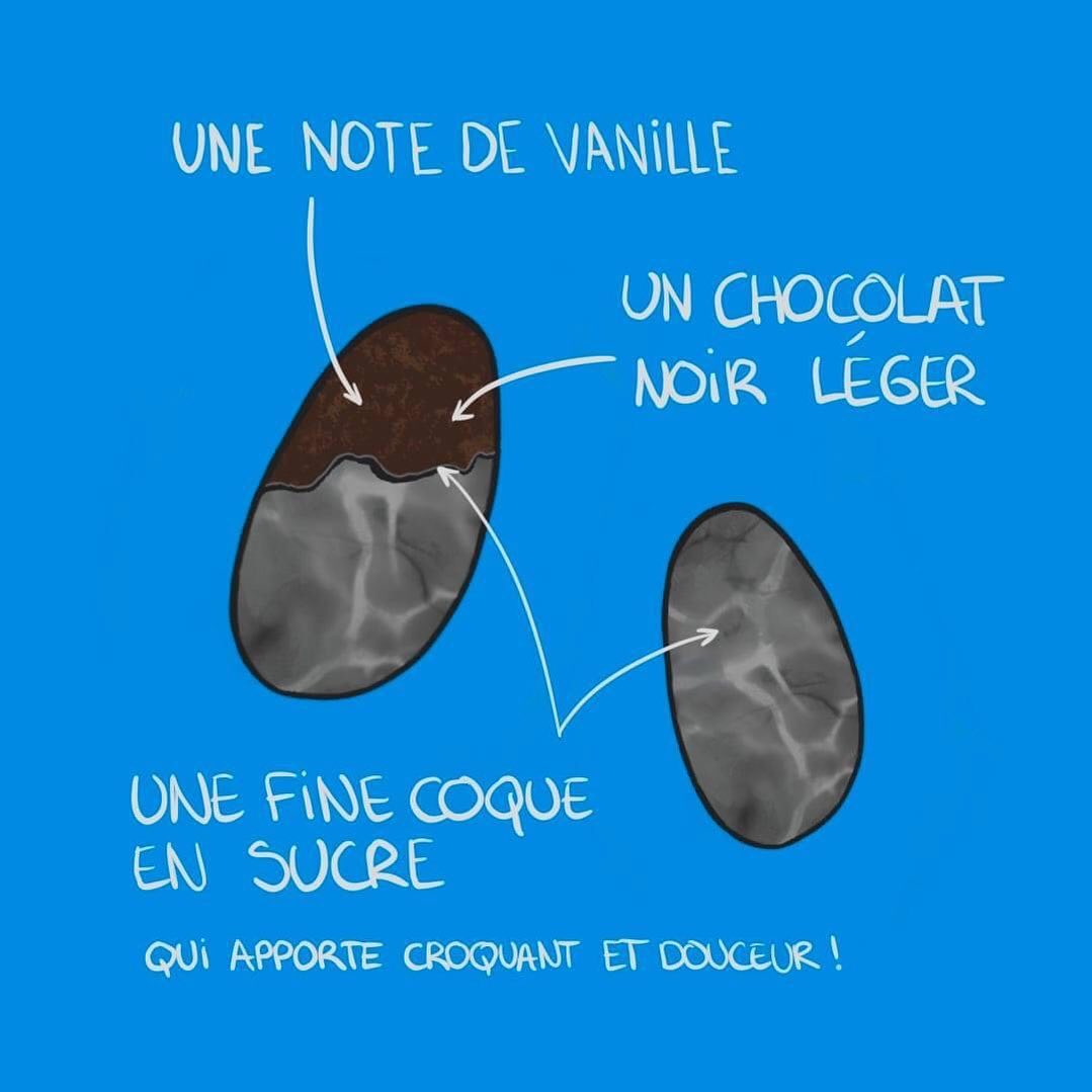 Le Galet Bleu, confiserie aux deux chocolats noir; une harmonie subtile et gourmande ! Son coeur fondant déploie une longue saveur de cacao, riche et persistante et sans amertume, tandis qu'une touche de vanille se glisse dans la fine coque en sucre. La maitrise du "mouchetage" crée un effet trompe l'oeil saisissant, révélant toute la finesse aromatique de cette création exclusive.